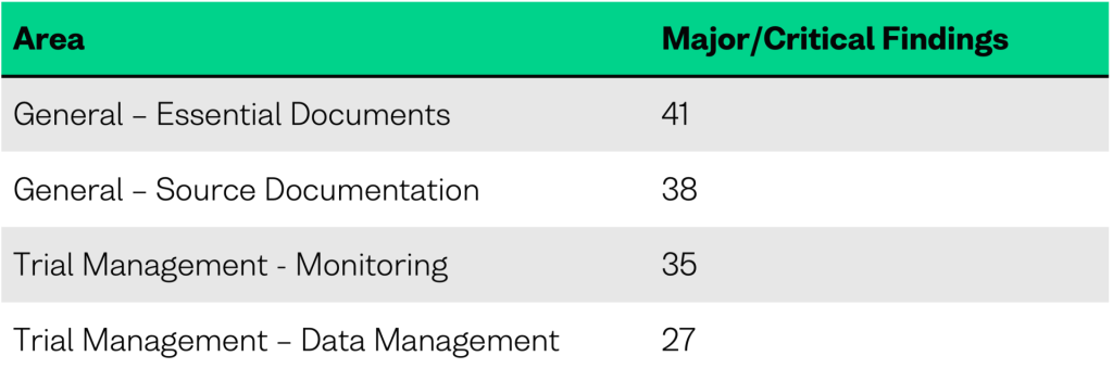 Across all inspections, inspectors identified 335 major or critical compliance gaps, of which over 96% were classified as major. A substantial proportion of these findings were in the general and trial management categories.